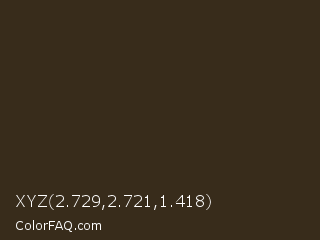 XYZ 2.729,2.721,1.418 Color is a very dark orange color and the nearest color is Black Marlin #3e2c1c. Hex code #382c1b and RGB value is rgb(56,44,27). In RGB color space, this color is composed of 22% red, 17% green, 11% blue, In CMYK color space, this color is composed of 0% cyan, 21% magenta, 52% yellow , 78% black , In HSL color space, this color has a hue angle of 35° , 35% saturation and 16% lightness.