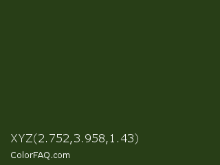 XYZ 2.752,3.958,1.43 Color is a very dark green color and the nearest color is Mallard #233418. Hex code #283e17 and RGB value is rgb(40,62,23). In RGB color space, this color is composed of 16% red, 24% green, 9% blue, In CMYK color space, this color is composed of 35% cyan, 0% magenta, 63% yellow , 76% black , In HSL color space, this color has a hue angle of 94° , 46% saturation and 17% lightness.