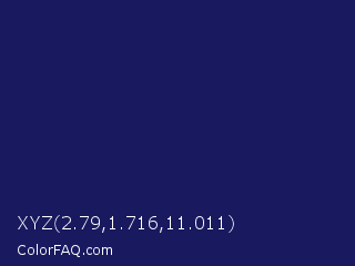 XYZ 2.79,1.716,11.011 Color is a dark blue color and the nearest color is Lucky Point #1a1a68. Hex code #18195f and RGB value is rgb(24,25,95). In RGB color space, this color is composed of 9% red, 10% green, 37% blue, In CMYK color space, this color is composed of 75% cyan, 74% magenta, 0% yellow , 63% black , In HSL color space, this color has a hue angle of 239° , 60% saturation and 23% lightness.