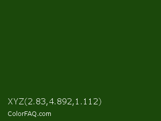 XYZ 2.83,4.892,1.112 Color is a very dark green color and the nearest color is Green House #24500f. Hex code #1b480b and RGB value is rgb(27,72,11). In RGB color space, this color is composed of 11% red, 28% green, 4% blue, In CMYK color space, this color is composed of 63% cyan, 0% magenta, 85% yellow , 72% black , In HSL color space, this color has a hue angle of 104° , 73% saturation and 16% lightness.