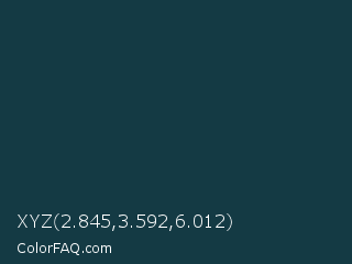 XYZ 2.845,3.592,6.012 Color is a very dark cyan color and the nearest color is Elephant #123447. Hex code #143a44 and RGB value is rgb(20,58,68). In RGB color space, this color is composed of 8% red, 23% green, 27% blue, In CMYK color space, this color is composed of 71% cyan, 15% magenta, 0% yellow , 73% black , In HSL color space, this color has a hue angle of 193° , 55% saturation and 17% lightness.