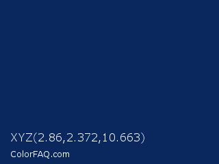 XYZ 2.86,2.372,10.663 Color is a very dark blue color and the nearest color is Madison #09255d. Hex code #0a285d and RGB value is rgb(10,40,93). In RGB color space, this color is composed of 4% red, 16% green, 36% blue, In CMYK color space, this color is composed of 89% cyan, 57% magenta, 0% yellow , 64% black , In HSL color space, this color has a hue angle of 218° , 81% saturation and 20% lightness.