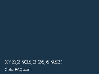 XYZ 2.935,3.26,6.953 Color is a very dark blue color and the nearest color is Nile Blue #193751. Hex code #1a354a and RGB value is rgb(26,53,74). In RGB color space, this color is composed of 10% red, 21% green, 29% blue, In CMYK color space, this color is composed of 65% cyan, 28% magenta, 0% yellow , 71% black , In HSL color space, this color has a hue angle of 206° , 48% saturation and 20% lightness.