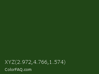 XYZ 2.972,4.766,1.574 Color is a very dark green color and the nearest color is Green House #24500f. Hex code #214617 and RGB value is rgb(33,70,23). In RGB color space, this color is composed of 13% red, 27% green, 9% blue, In CMYK color space, this color is composed of 53% cyan, 0% magenta, 67% yellow , 73% black , In HSL color space, this color has a hue angle of 107° , 51% saturation and 18% lightness.