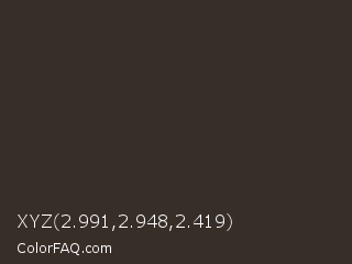 XYZ 2.991,2.948,2.419 Color is a very dark orange color and the nearest color is Birch #373021. Hex code #382e28 and RGB value is rgb(56,46,40). In RGB color space, this color is composed of 22% red, 18% green, 16% blue, In CMYK color space, this color is composed of 0% cyan, 18% magenta, 29% yellow , 78% black , In HSL color space, this color has a hue angle of 23° , 17% saturation and 19% lightness.