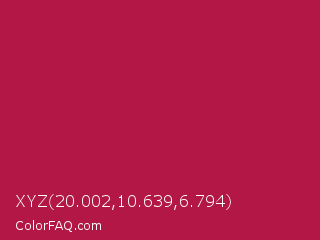 XYZ 20.002,10.639,6.794 Color is a normal rose color and the nearest color is French Wine #ac1e44. Hex code #b31746 and RGB value is rgb(179,23,70). In RGB color space, this color is composed of 70% red, 9% green, 27% blue, In CMYK color space, this color is composed of 0% cyan, 87% magenta, 61% yellow , 30% black , In HSL color space, this color has a hue angle of 342° , 77% saturation and 40% lightness.