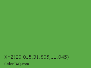 XYZ 20.015,31.805,11.045 Color is a normal green color and the nearest color is Apple #4fa83d. Hex code #5bab47 and RGB value is rgb(91,171,71). In RGB color space, this color is composed of 36% red, 67% green, 28% blue, In CMYK color space, this color is composed of 47% cyan, 0% magenta, 58% yellow , 33% black , In HSL color space, this color has a hue angle of 108° , 41% saturation and 47% lightness.
