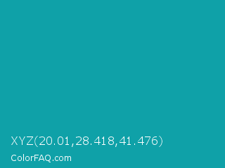 XYZ 20.01,28.418,41.476 Color is a normal cyan color and the nearest color is Eastern Blue #1e9ab0. Hex code #0fa1a8 and RGB value is rgb(15,161,168). In RGB color space, this color is composed of 6% red, 63% green, 66% blue, In CMYK color space, this color is composed of 91% cyan, 4% magenta, 0% yellow , 34% black , In HSL color space, this color has a hue angle of 183° , 84% saturation and 36% lightness.