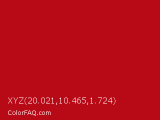 XYZ 20.021,10.465,1.724 Color is a normal red color and the nearest color is International Orange Engineering #ba160c. Hex code #b80a16 and RGB value is rgb(184,10,22). In RGB color space, this color is composed of 72% red, 4% green, 9% blue, In CMYK color space, this color is composed of 0% cyan, 95% magenta, 88% yellow , 28% black , In HSL color space, this color has a hue angle of 356° , 90% saturation and 38% lightness.