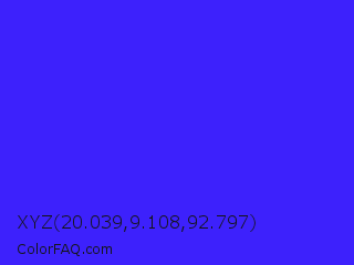 XYZ 20.039,9.108,92.797 Color is a normal indigo color and the nearest color is Han Purple #5218fa. Hex code #3d21fc and RGB value is rgb(61,33,252). In RGB color space, this color is composed of 24% red, 13% green, 99% blue, In CMYK color space, this color is composed of 76% cyan, 87% magenta, 0% yellow , 1% black , In HSL color space, this color has a hue angle of 248° , 97% saturation and 56% lightness.