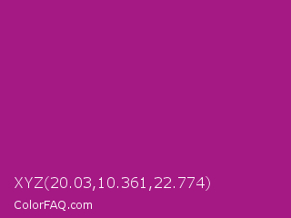 XYZ 20.03,10.361,22.774 Color is a normal magenta color and the nearest color is Violet Eggplant #991199. Hex code #a51984 and RGB value is rgb(165,25,132). In RGB color space, this color is composed of 65% red, 10% green, 52% blue, In CMYK color space, this color is composed of 0% cyan, 85% magenta, 20% yellow , 35% black , In HSL color space, this color has a hue angle of 314° , 74% saturation and 37% lightness.