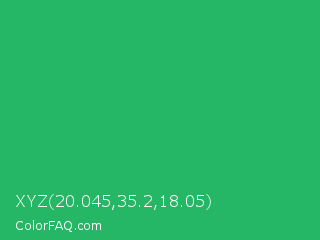 XYZ 20.045,35.2,18.05 Color is a normal green color and the nearest color is Green Crayola #1cac78. Hex code #25b765 and RGB value is rgb(37,183,101). In RGB color space, this color is composed of 15% red, 72% green, 40% blue, In CMYK color space, this color is composed of 80% cyan, 0% magenta, 45% yellow , 28% black , In HSL color space, this color has a hue angle of 146° , 66% saturation and 43% lightness.
