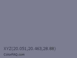 XYZ 20.051,20.463,28.88 Color is a normal blue color and the nearest color is Waterloo #7b7c94. Hex code #797c8f and RGB value is rgb(121,124,143). In RGB color space, this color is composed of 47% red, 49% green, 56% blue, In CMYK color space, this color is composed of 15% cyan, 13% magenta, 0% yellow , 44% black , In HSL color space, this color has a hue angle of 232° , 9% saturation and 52% lightness.