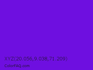 XYZ 20.056,9.038,71.209 Color is a normal violet color and the nearest color is French Violet #8806ce. Hex code #6e0fe0 and RGB value is rgb(110,15,224). In RGB color space, this color is composed of 43% red, 6% green, 88% blue, In CMYK color space, this color is composed of 51% cyan, 93% magenta, 0% yellow , 12% black , In HSL color space, this color has a hue angle of 267° , 87% saturation and 47% lightness.