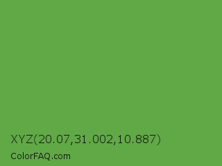 XYZ 20.07,31.002,10.887 Color is a normal green color and the nearest color is Apple #4fa83d. Hex code #61a847 and RGB value is rgb(97,168,71). In RGB color space, this color is composed of 38% red, 66% green, 28% blue, In CMYK color space, this color is composed of 42% cyan, 0% magenta, 58% yellow , 34% black , In HSL color space, this color has a hue angle of 104° , 41% saturation and 47% lightness.