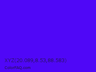 XYZ 20.089,8.53,88.583 Color is a normal indigo color and the nearest color is Han Purple #5218fa. Hex code #4f07f7 and RGB value is rgb(79,7,247). In RGB color space, this color is composed of 31% red, 3% green, 97% blue, In CMYK color space, this color is composed of 68% cyan, 97% magenta, 0% yellow , 3% black , In HSL color space, this color has a hue angle of 258° , 94% saturation and 50% lightness.