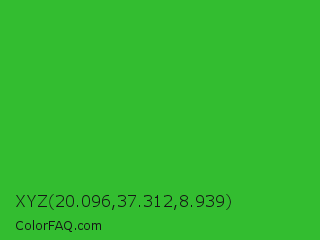 XYZ 20.096,37.312,8.939 Color is a normal green color and the nearest color is Wageningen Green #34b233. Hex code #33bd30 and RGB value is rgb(51,189,48). In RGB color space, this color is composed of 20% red, 74% green, 19% blue, In CMYK color space, this color is composed of 73% cyan, 0% magenta, 75% yellow , 26% black , In HSL color space, this color has a hue angle of 119° , 59% saturation and 46% lightness.