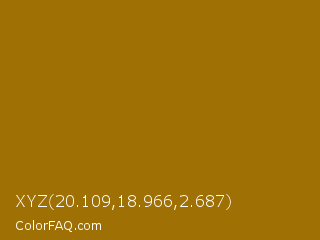XYZ 20.109,18.966,2.687 Color is a normal orange color and the nearest color is Buttered Rum #a1750d. Hex code #9f7003 and RGB value is rgb(159,112,3). In RGB color space, this color is composed of 62% red, 44% green, 1% blue, In CMYK color space, this color is composed of 0% cyan, 30% magenta, 98% yellow , 38% black , In HSL color space, this color has a hue angle of 42° , 96% saturation and 32% lightness.