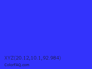 XYZ 20.12,10.1,92.984 Color is a normal blue color and the nearest color is Palatinate Blue #273be2. Hex code #3333fc and RGB value is rgb(51,51,252). In RGB color space, this color is composed of 20% red, 20% green, 99% blue, In CMYK color space, this color is composed of 80% cyan, 80% magenta, 0% yellow , 1% black , In HSL color space, this color has a hue angle of 240° , 97% saturation and 59% lightness.
