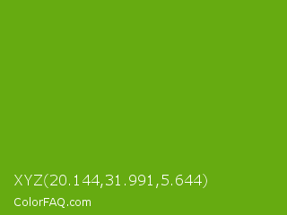 XYZ 20.144,31.991,5.644 Color is a normal green color and the nearest color is Christi #67a712. Hex code #66ab11 and RGB value is rgb(102,171,17). In RGB color space, this color is composed of 40% red, 67% green, 7% blue, In CMYK color space, this color is composed of 40% cyan, 0% magenta, 90% yellow , 33% black , In HSL color space, this color has a hue angle of 87° , 82% saturation and 37% lightness.