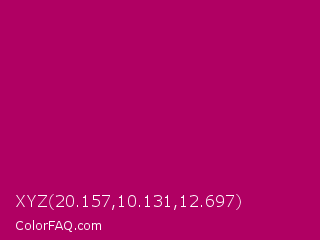 XYZ 20.157,10.131,12.697 Color is a normal magenta color and the nearest color is Lipstick #ab0563. Hex code #b00063 and RGB value is rgb(176,0,99). In RGB color space, this color is composed of 69% red, 0% green, 39% blue, In CMYK color space, this color is composed of 0% cyan, 100% magenta, 44% yellow , 31% black , In HSL color space, this color has a hue angle of 326° , 100% saturation and 35% lightness.