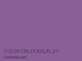 XYZ 20.159,15.822,31.27 Color is a normal purple color and the nearest color is Trendy Pink #8c6495. Hex code #8a5f97 and RGB value is rgb(138,95,151). In RGB color space, this color is composed of 54% red, 37% green, 59% blue, In CMYK color space, this color is composed of 9% cyan, 37% magenta, 0% yellow , 41% black , In HSL color space, this color has a hue angle of 286° , 23% saturation and 48% lightness.
