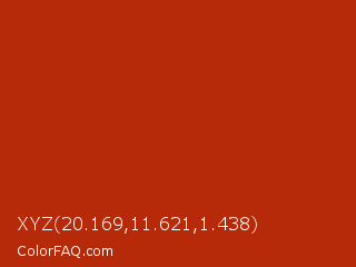 XYZ 20.169,11.621,1.438 Color is a normal red color and the nearest color is Thunderbird #c02b18. Hex code #b62a09 and RGB value is rgb(182,42,9). In RGB color space, this color is composed of 71% red, 16% green, 4% blue, In CMYK color space, this color is composed of 0% cyan, 77% magenta, 95% yellow , 29% black , In HSL color space, this color has a hue angle of 11° , 91% saturation and 37% lightness.
