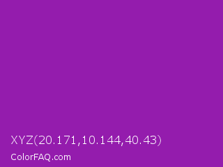 XYZ 20.171,10.144,40.43 Color is a normal purple color and the nearest color is Violet Eggplant #991199. Hex code #941cad and RGB value is rgb(148,28,173). In RGB color space, this color is composed of 58% red, 11% green, 68% blue, In CMYK color space, this color is composed of 14% cyan, 84% magenta, 0% yellow , 32% black , In HSL color space, this color has a hue angle of 290° , 72% saturation and 39% lightness.
