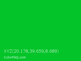 XYZ 20.178,39.659,8.689 Color is a normal green color and the nearest color is Vivid Malachite #00cc33. Hex code #03c429 and RGB value is rgb(3,196,41). In RGB color space, this color is composed of 1% red, 77% green, 16% blue, In CMYK color space, this color is composed of 98% cyan, 0% magenta, 79% yellow , 23% black , In HSL color space, this color has a hue angle of 132° , 97% saturation and 39% lightness.