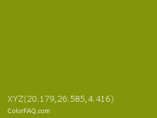 XYZ 20.179,26.585,4.416 Color is a normal yellow color and the nearest color is Trendy Green #7c881a. Hex code #82960c and RGB value is rgb(130,150,12). In RGB color space, this color is composed of 51% red, 59% green, 5% blue, In CMYK color space, this color is composed of 13% cyan, 0% magenta, 92% yellow , 41% black , In HSL color space, this color has a hue angle of 69° , 85% saturation and 32% lightness.