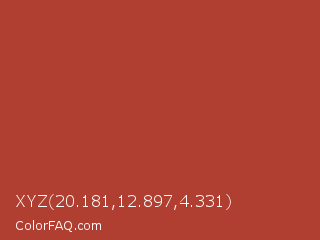 XYZ 20.181,12.897,4.331 Color is a normal red color and the nearest color is Medium Carmine #af4035. Hex code #b03e31 and RGB value is rgb(176,62,49). In RGB color space, this color is composed of 69% red, 24% green, 19% blue, In CMYK color space, this color is composed of 0% cyan, 65% magenta, 72% yellow , 31% black , In HSL color space, this color has a hue angle of 6° , 56% saturation and 44% lightness.