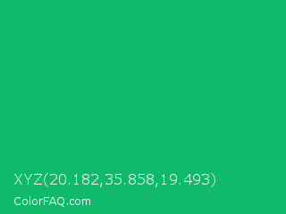 XYZ 20.182,35.858,19.493 Color is a normal green color and the nearest color is Green Crayola #1cac78. Hex code #11b96a and RGB value is rgb(17,185,106). In RGB color space, this color is composed of 7% red, 73% green, 42% blue, In CMYK color space, this color is composed of 91% cyan, 0% magenta, 43% yellow , 27% black , In HSL color space, this color has a hue angle of 152° , 83% saturation and 40% lightness.