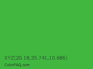 XYZ 20.18,35.741,10.686 Color is a normal green color and the nearest color is Wageningen Green #34b233. Hex code #40b840 and RGB value is rgb(64,184,64). In RGB color space, this color is composed of 25% red, 72% green, 25% blue, In CMYK color space, this color is composed of 65% cyan, 0% magenta, 65% yellow , 28% black , In HSL color space, this color has a hue angle of 120° , 48% saturation and 49% lightness.
