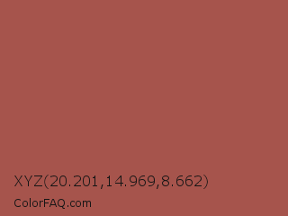XYZ 20.201,14.969,8.662 Color is a normal red color and the nearest color is Middle Red Purple #a55353. Hex code #a6544c and RGB value is rgb(166,84,76). In RGB color space, this color is composed of 65% red, 33% green, 30% blue, In CMYK color space, this color is composed of 0% cyan, 49% magenta, 54% yellow , 35% black , In HSL color space, this color has a hue angle of 5° , 37% saturation and 47% lightness.