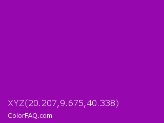 XYZ 20.207,9.675,40.338 Color is a normal magenta color and the nearest color is Violet RYB #8601af. Hex code #9608ad and RGB value is rgb(150,8,173). In RGB color space, this color is composed of 59% red, 3% green, 68% blue, In CMYK color space, this color is composed of 13% cyan, 95% magenta, 0% yellow , 32% black , In HSL color space, this color has a hue angle of 292° , 91% saturation and 35% lightness.