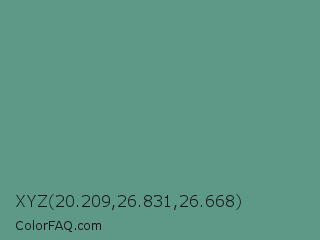 XYZ 20.209,26.831,26.668 Color is a normal green color and the nearest color is Patina #639a8f. Hex code #5d9986 and RGB value is rgb(93,153,134). In RGB color space, this color is composed of 36% red, 60% green, 53% blue, In CMYK color space, this color is composed of 39% cyan, 0% magenta, 12% yellow , 40% black , In HSL color space, this color has a hue angle of 161° , 24% saturation and 48% lightness.