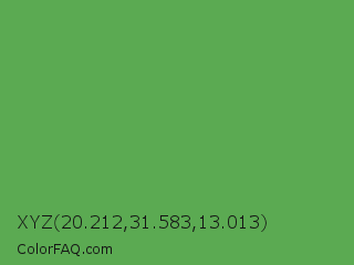 XYZ 20.212,31.583,13.013 Color is a normal green color and the nearest color is Fruit Salad #4f9d5d. Hex code #5baa52 and RGB value is rgb(91,170,82). In RGB color space, this color is composed of 36% red, 67% green, 32% blue, In CMYK color space, this color is composed of 46% cyan, 0% magenta, 52% yellow , 33% black , In HSL color space, this color has a hue angle of 114° , 35% saturation and 49% lightness.