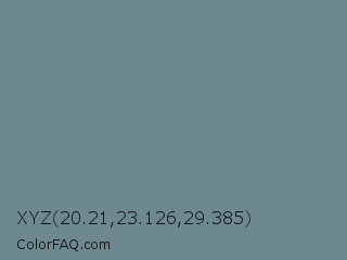 XYZ 20.21,23.126,29.385 Color is a normal cyan color and the nearest color is Juniper #6d9292. Hex code #6d898f and RGB value is rgb(109,137,143). In RGB color space, this color is composed of 43% red, 54% green, 56% blue, In CMYK color space, this color is composed of 24% cyan, 4% magenta, 0% yellow , 44% black , In HSL color space, this color has a hue angle of 191° , 13% saturation and 49% lightness.