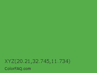 XYZ 20.21,32.745,11.734 Color is a normal green color and the nearest color is Apple #4fa83d. Hex code #56ae4a and RGB value is rgb(86,174,74). In RGB color space, this color is composed of 34% red, 68% green, 29% blue, In CMYK color space, this color is composed of 51% cyan, 0% magenta, 57% yellow , 32% black , In HSL color space, this color has a hue angle of 113° , 40% saturation and 49% lightness.