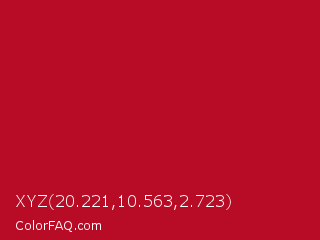 XYZ 20.221,10.563,2.723 Color is a normal red color and the nearest color is Shiraz #b20931. Hex code #b80b25 and RGB value is rgb(184,11,37). In RGB color space, this color is composed of 72% red, 4% green, 15% blue, In CMYK color space, this color is composed of 0% cyan, 94% magenta, 80% yellow , 28% black , In HSL color space, this color has a hue angle of 351° , 89% saturation and 38% lightness.