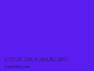 XYZ 20.236,9.284,82.387 Color is a normal indigo color and the nearest color is Han Purple #5218fa. Hex code #5a1def and RGB value is rgb(90,29,239). In RGB color space, this color is composed of 35% red, 11% green, 94% blue, In CMYK color space, this color is composed of 62% cyan, 88% magenta, 0% yellow , 6% black , In HSL color space, this color has a hue angle of 257° , 87% saturation and 53% lightness.