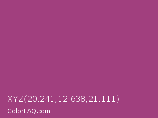 XYZ 20.241,12.638,21.111 Color is a normal magenta color and the nearest color is Maximum Red Purple #a63a79. Hex code #a13f7e and RGB value is rgb(161,63,126). In RGB color space, this color is composed of 63% red, 25% green, 49% blue, In CMYK color space, this color is composed of 0% cyan, 61% magenta, 22% yellow , 37% black , In HSL color space, this color has a hue angle of 321° , 44% saturation and 44% lightness.
