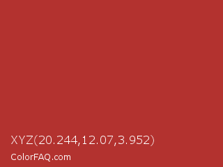 XYZ 20.244,12.07,3.952 Color is a normal red color and the nearest color is Well Read #b43332. Hex code #b3322f and RGB value is rgb(179,50,47). In RGB color space, this color is composed of 70% red, 20% green, 18% blue, In CMYK color space, this color is composed of 0% cyan, 72% magenta, 74% yellow , 30% black , In HSL color space, this color has a hue angle of 1° , 58% saturation and 44% lightness.