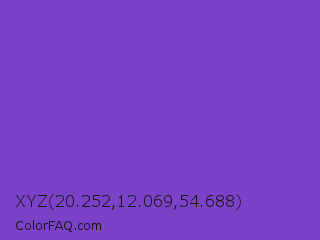 XYZ 20.252,12.069,54.688 Color is a normal violet color and the nearest color is Fuchsia Blue #7a58c1. Hex code #7b41c6 and RGB value is rgb(123,65,198). In RGB color space, this color is composed of 48% red, 25% green, 78% blue, In CMYK color space, this color is composed of 38% cyan, 67% magenta, 0% yellow , 22% black , In HSL color space, this color has a hue angle of 266° , 54% saturation and 52% lightness.