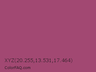 XYZ 20.255,13.531,17.464 Color is a normal rose color and the nearest color is Magenta Haze #9f4576. Hex code #a24872 and RGB value is rgb(162,72,114). In RGB color space, this color is composed of 64% red, 28% green, 45% blue, In CMYK color space, this color is composed of 0% cyan, 56% magenta, 30% yellow , 36% black , In HSL color space, this color has a hue angle of 332° , 38% saturation and 46% lightness.