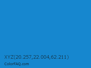 XYZ 20.257,22.004,62.211 Color is a normal blue color and the nearest color is Cyan Cornflower Blue #188bc2. Hex code #1687cf and RGB value is rgb(22,135,207). In RGB color space, this color is composed of 9% red, 53% green, 81% blue, In CMYK color space, this color is composed of 89% cyan, 35% magenta, 0% yellow , 19% black , In HSL color space, this color has a hue angle of 203° , 81% saturation and 45% lightness.