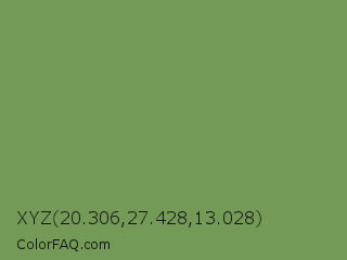 XYZ 20.306,27.428,13.028 Color is a normal green color and the nearest color is Asparagus Green #7ba05b. Hex code #739a56 and RGB value is rgb(115,154,86). In RGB color space, this color is composed of 45% red, 60% green, 34% blue, In CMYK color space, this color is composed of 25% cyan, 0% magenta, 44% yellow , 40% black , In HSL color space, this color has a hue angle of 94° , 28% saturation and 47% lightness.