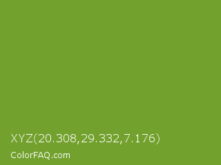 XYZ 20.308,29.332,7.176 Color is a normal green color and the nearest color is Palm Leaf #6f9940. Hex code #73a12e and RGB value is rgb(115,161,46). In RGB color space, this color is composed of 45% red, 63% green, 18% blue, In CMYK color space, this color is composed of 29% cyan, 0% magenta, 71% yellow , 37% black , In HSL color space, this color has a hue angle of 84° , 56% saturation and 41% lightness.
