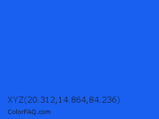 XYZ 20.312,14.864,84.236 Color is a normal blue color and the nearest color is Blue Crayola #1f75fe. Hex code #1960f0 and RGB value is rgb(25,96,240). In RGB color space, this color is composed of 10% red, 38% green, 94% blue, In CMYK color space, this color is composed of 90% cyan, 60% magenta, 0% yellow , 6% black , In HSL color space, this color has a hue angle of 220° , 88% saturation and 52% lightness.