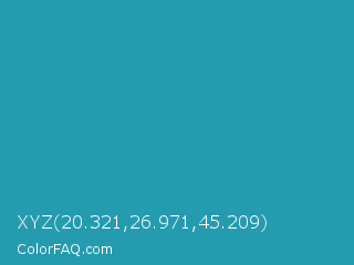 XYZ 20.321,26.971,45.209 Color is a normal cyan color and the nearest color is Eastern Blue #1e9ab0. Hex code #259bb0 and RGB value is rgb(37,155,176). In RGB color space, this color is composed of 15% red, 61% green, 69% blue, In CMYK color space, this color is composed of 79% cyan, 12% magenta, 0% yellow , 31% black , In HSL color space, this color has a hue angle of 189° , 65% saturation and 42% lightness.